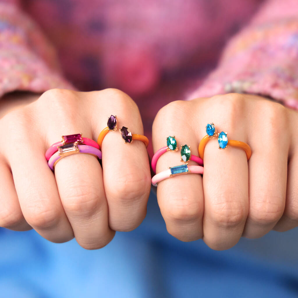 Select a mix of metals. Often you can use a range of metals to give a contrast and change of texture. We have a selection of gold and silver plated rings to achieve this. As well as gold and silver, you can also use our beautiful gemstones to show off their natural beauty against the simpler metals. Stack alternate colours on top of one another or opt for a