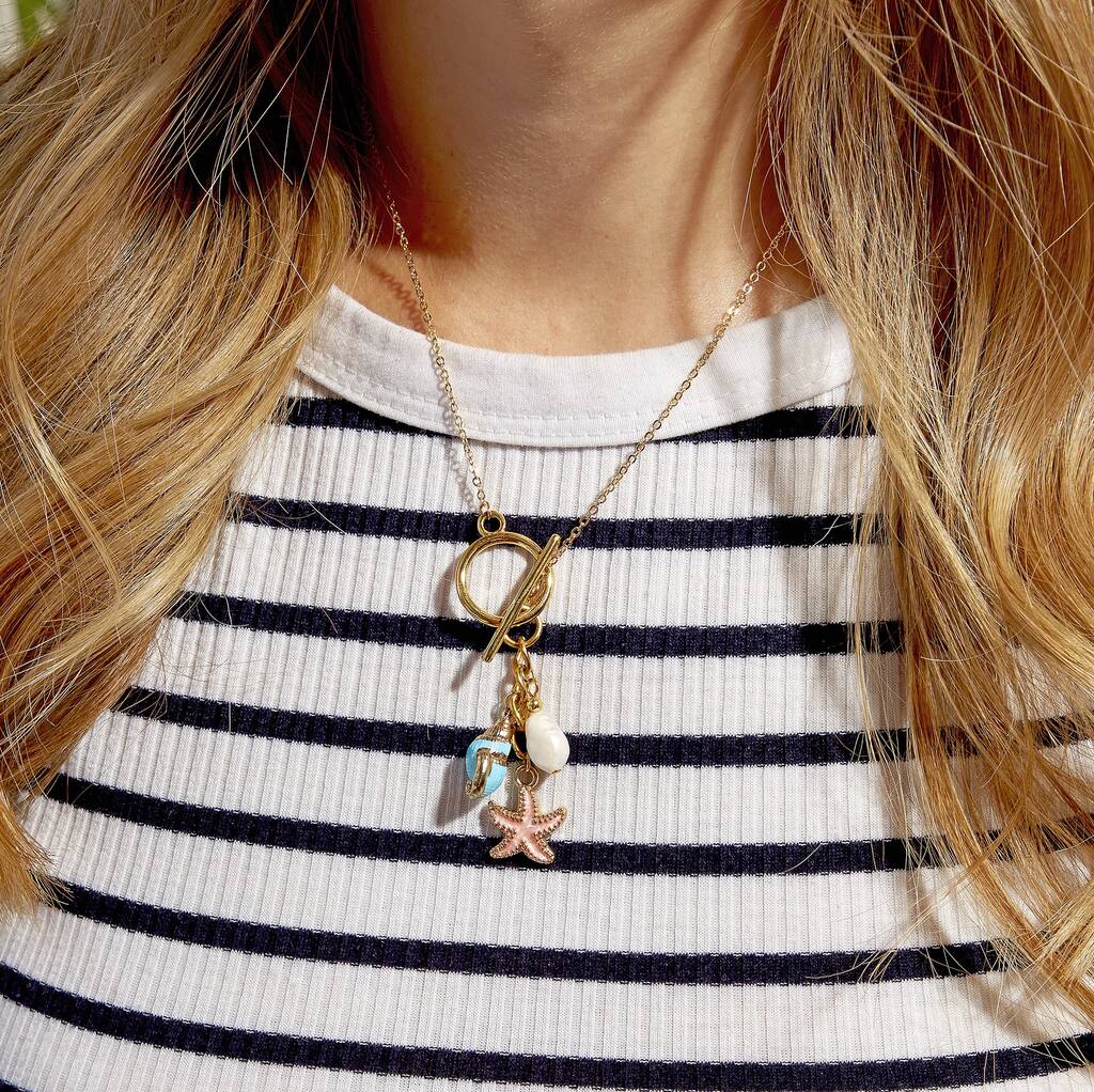 A dreamy cluster of beach-inspired charms – think natural shell, a luminous freshwater pearl, and the cutest enamel starfish – all gathered on a chic toggle clasp. All sat on a dainty gold plated trace chain that practically shouts “take me to the beach!”