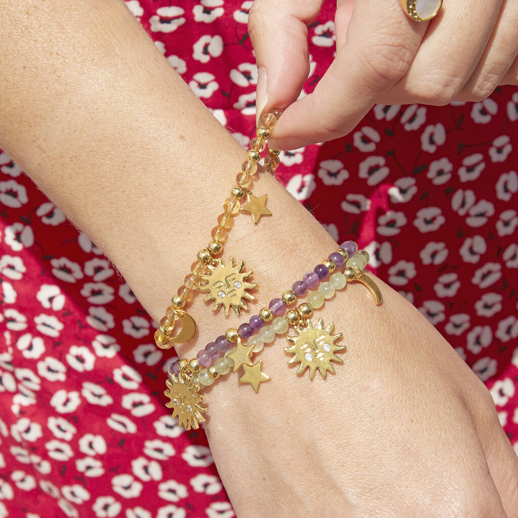 Smooth gemstones, a serene sun, and dreamy gold celestial charms - this bracelet is giving major summer energy